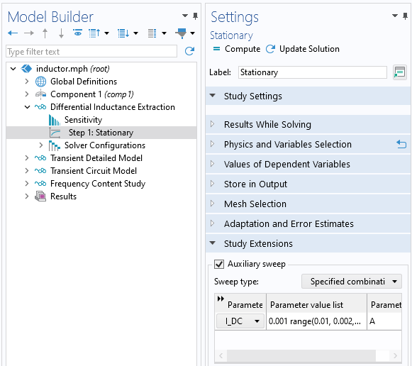 where L_{ij} is the secant inductance and is computed by default whenever a Coil feature is used. On the other hand, computing the differential inductance takes some extra steps.